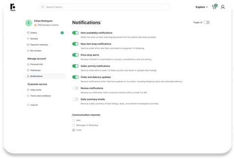 Notification Customization: Personalized alerts for orders, new listings, and updates.